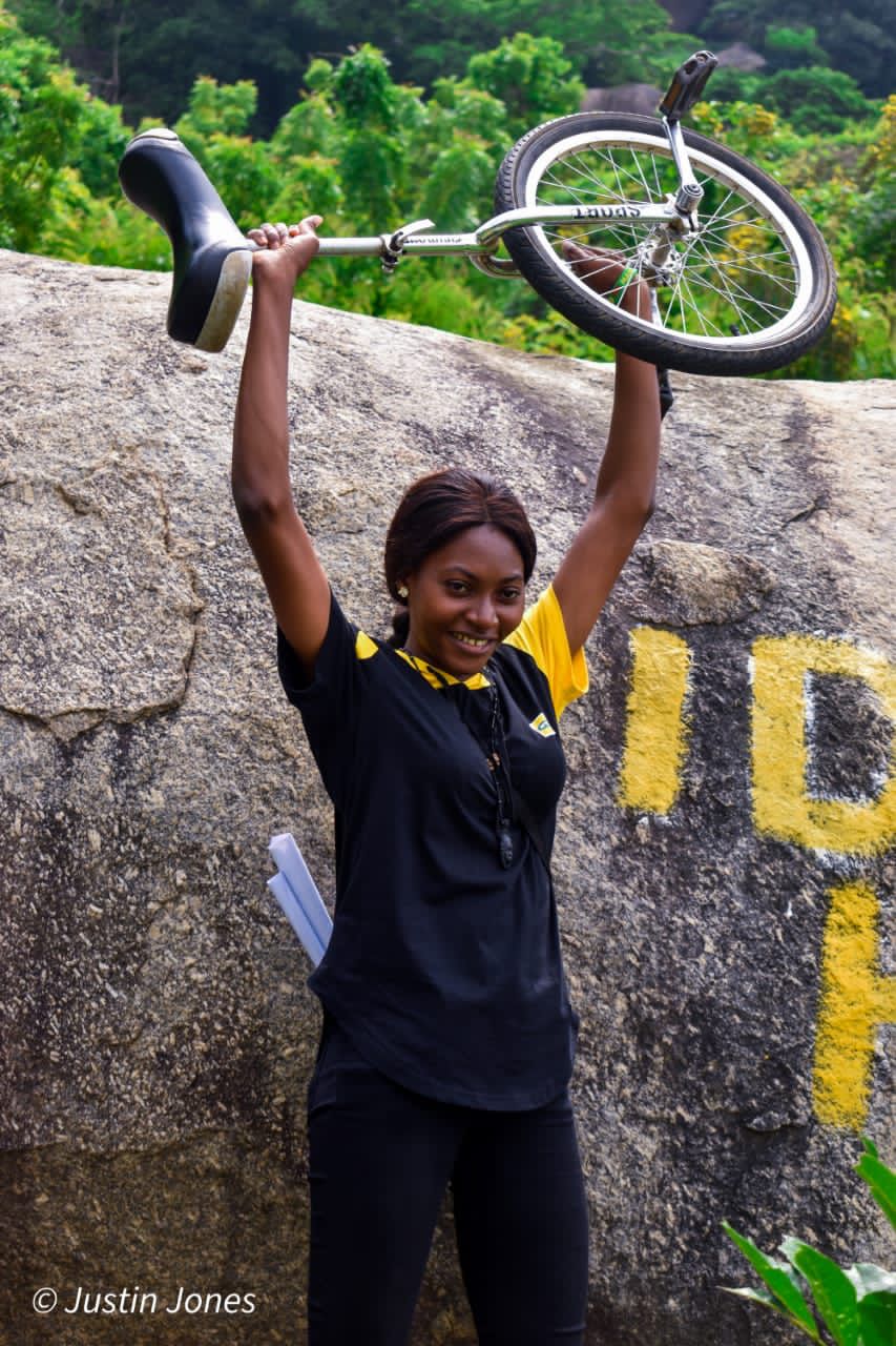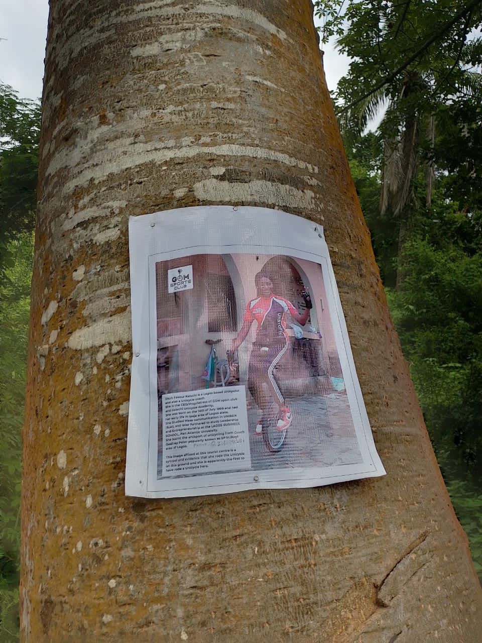 She learnt the art/sport of unicycling from Coach Godfrey Peter popularly known as SP in Ikoyi area of Lagos.