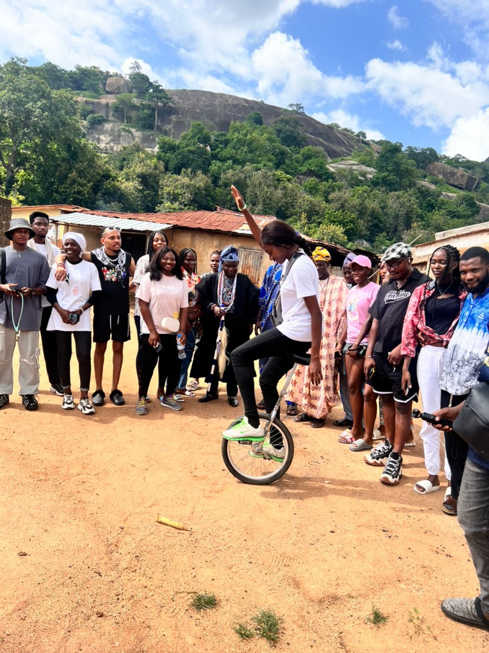 Favour went on the tour with a tour company (Sky Unit tour) and upon arrival, they were given a magnificent cultural welcome by the royal musical troupe, which was followed by a warm welcome by the Onidere of idere land in his palace. It was at this moment, the Unicyclist decided to give a free show of the Unicycle. This display amazed the whole community including the Kabiyesi (Onidere of idere land) as they have never seen such a vehicle before (A one-wheel). The Onidere commended the sport/art and couldn't help but flatter the Unicyclist saying "this is awesome, can I ride it?(trying to get a hold of it)"